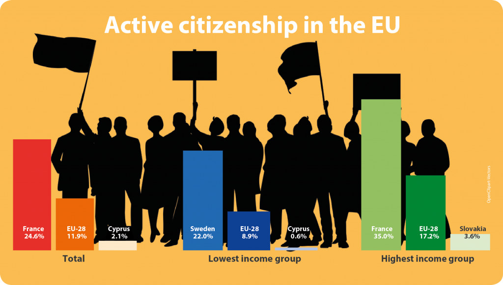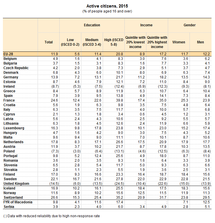 “2015’te Avrupa Birliği’ndeki (AB) yetişkin nüfusun %11,9’u aktif vatandaş olduklarını, yani toplantılara katıldıklarını, dilekçe imzaladıklarını veya siyasi gruplar, dernekler veya partilerle ilgili faaliyetlere katıldıklarını söyledi.