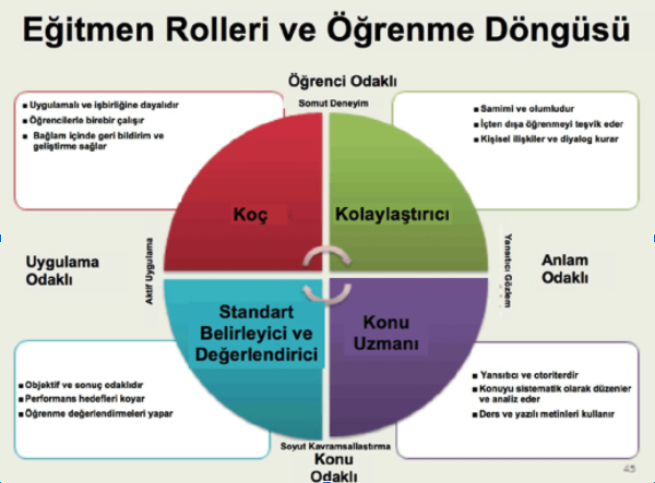Değerlendirici Rolü: Standart belirleyici ve değerlendirici olarak eğiticiler, öğrencilerin performans gereksinimlerini karşılamak için bilgi ve beceri uygulamasında ustalaşmalarına yardımcı olurlar. Nitelikli performans için gereken bilgi gereksinimlerini belirleyen, sonuç odaklı ve objektif bir stil benimserler. Öğrencilerin, kendi öğrenme süreçlerini değerlendirmeleri için performans egzersizleri oluştururlar.